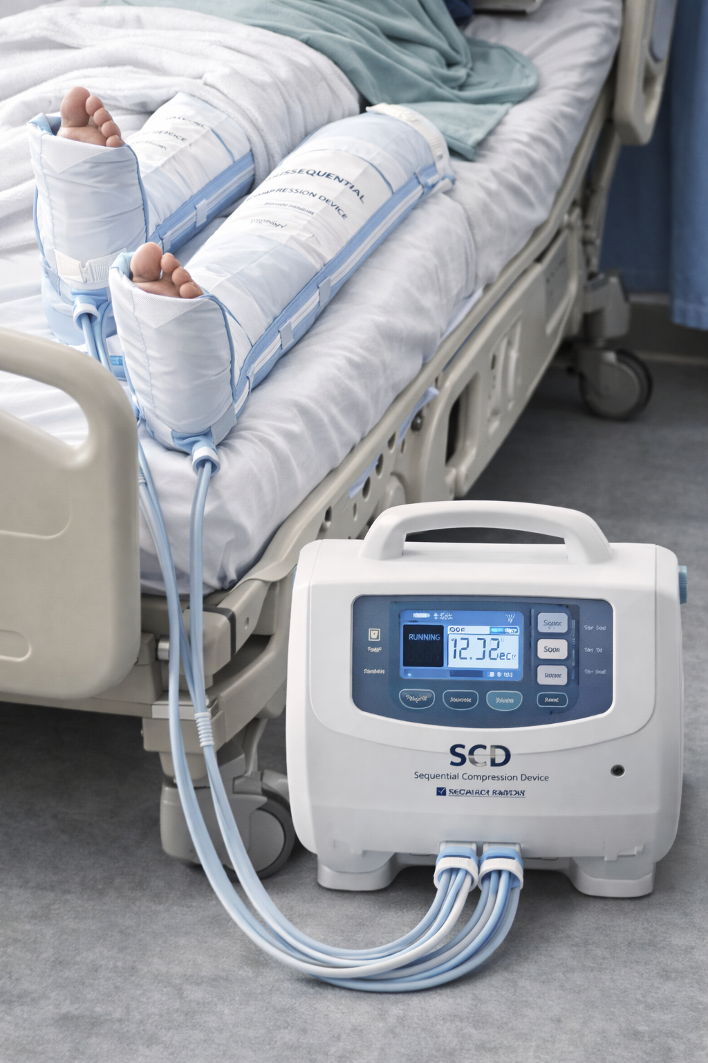 Sequential compression device to help prevent DVT by improving venous return in immobile or post-op patients.
